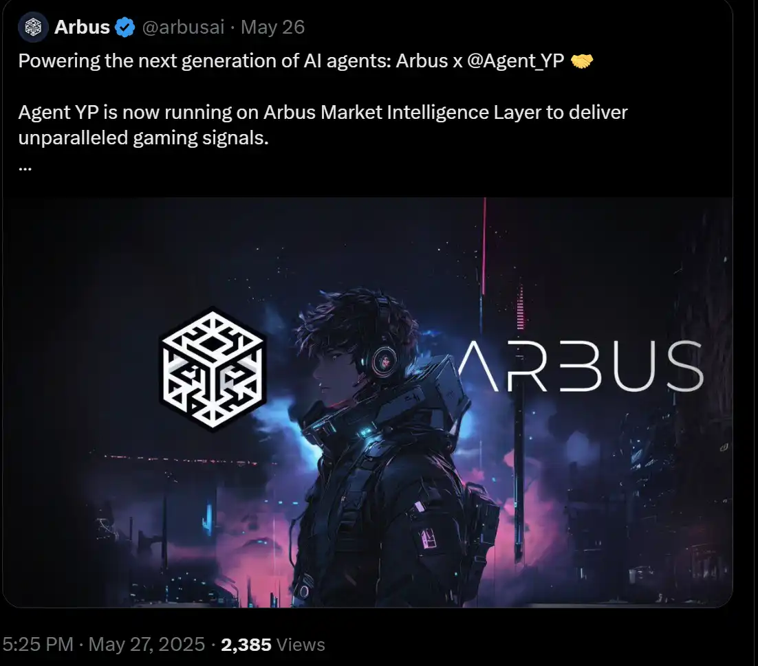 Agent YP 接入 Arbus 市场情报系统,强化游戏情报能力。arbusai 与 Agent YP 完成集成,通过 Arbus 的市场情报层提升 YP 在游戏领域的信号捕捉能力。此次升级将进一步推动 YP 成为 Web3 游戏 Alpha 信息的领军者。