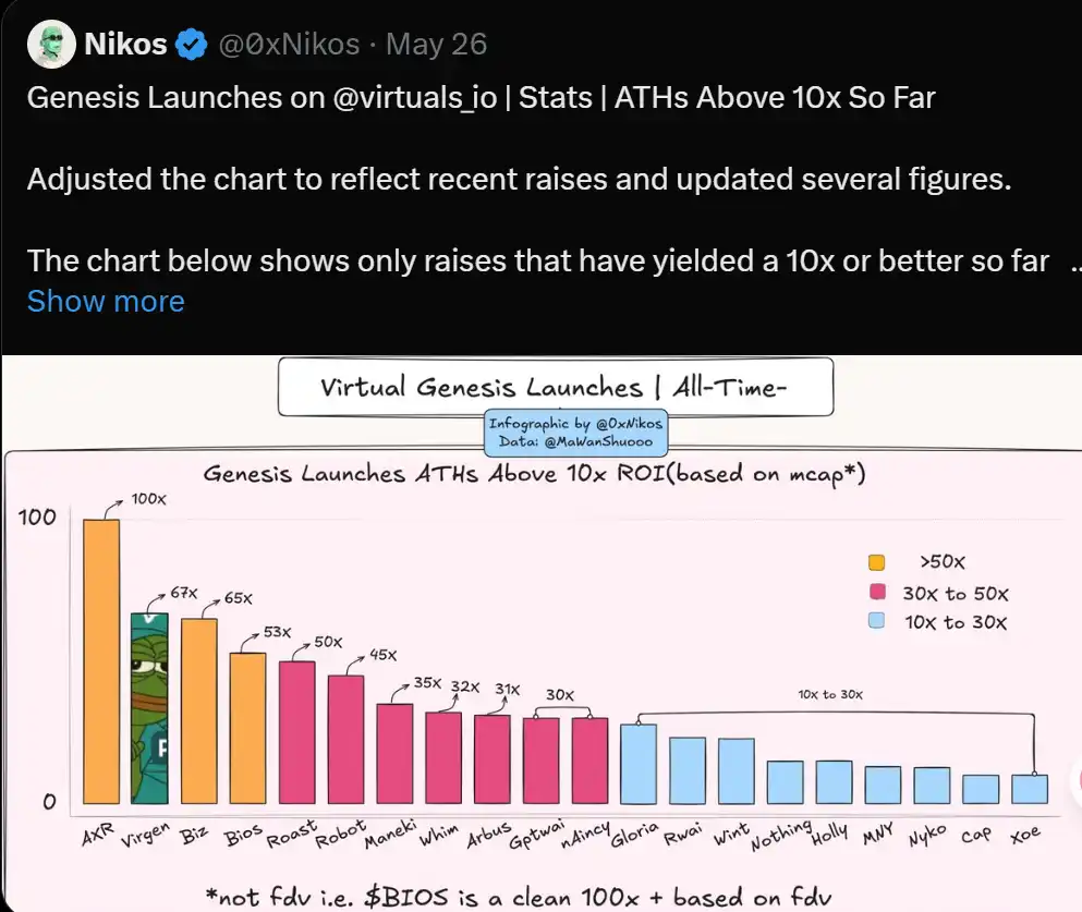 Genesis 项目超一半筹资项目回报达 10 倍以上,0xNikos 披露,virtuals io 的 Genesis 项目中,有 54.5% 的筹资项目实现 10 倍以上回报,其中 27.3% 超过 30 倍,12.1% 超过 50 倍。持续的高回报率显示出强劲的早期增长势头。