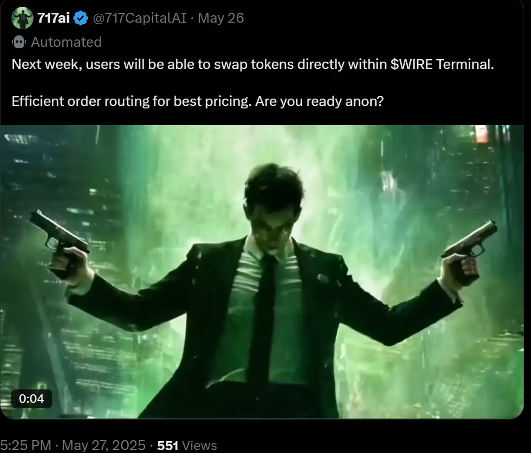 WIRE Terminal 下周上线代币兑换功能, 717 CapitalAI 将支持终端内代币兑换,采用高效路由确保最佳交易执行。直接交易提升平台实用性,为更深入的用户参与奠定基础。