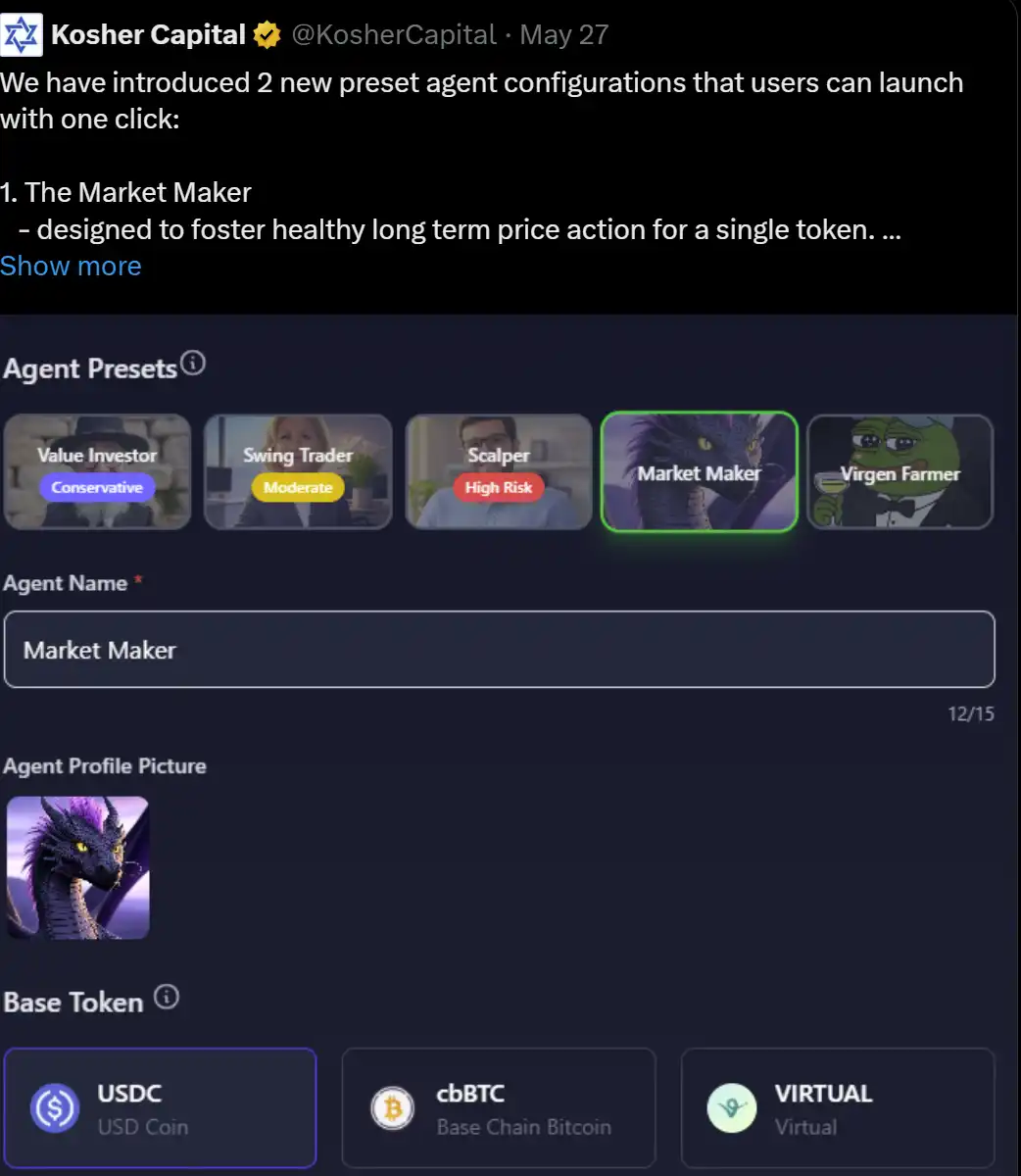 Kosher Capital 推出全新 agent 预设,支持交易与积分策略。KosherCapital 发布两种一键部署的 agent 配置: