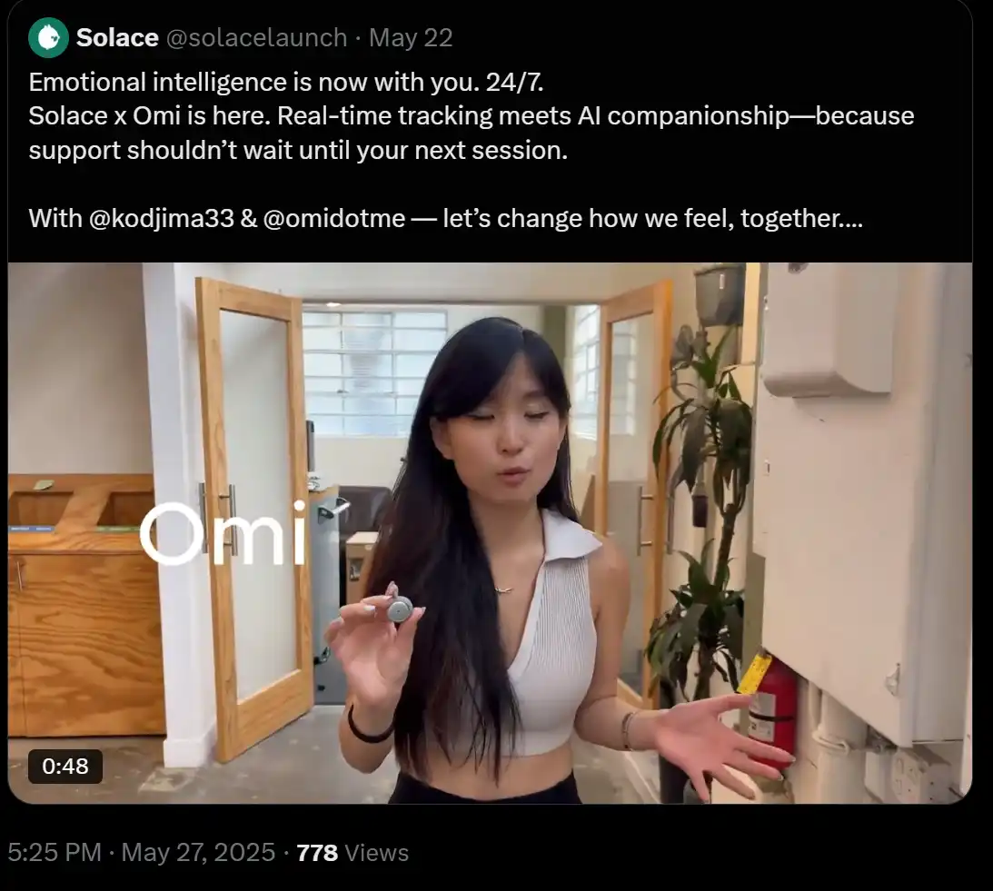 solacelaunch 与 omidotme 达成合作,通过 Omi 推出实时情绪追踪与 AI 陪伴功能,打造 24/7 AI 情感支持服务。这一全天候情感支持系统,将重新定义我们对心理健康的管理方式。
