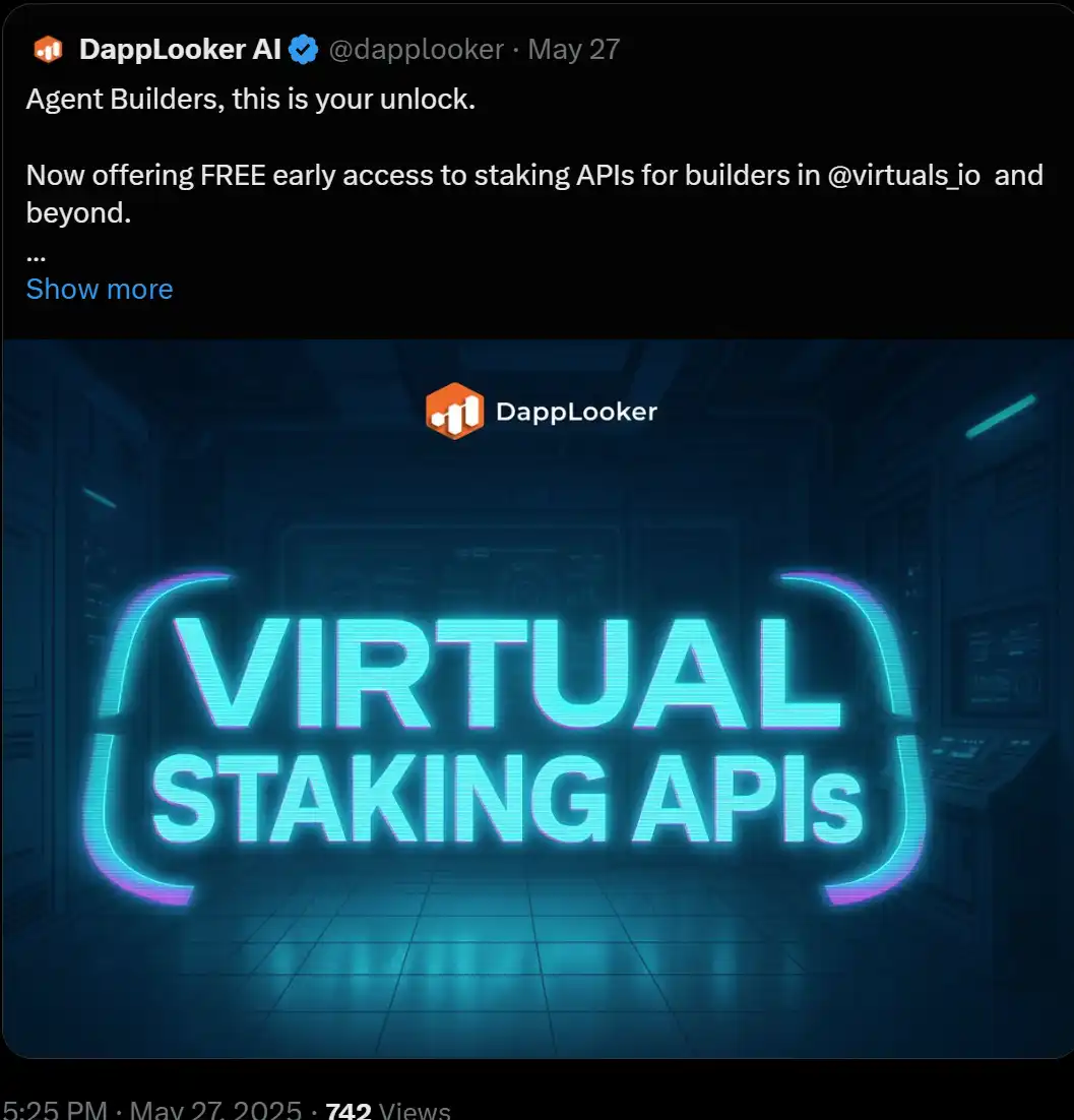 DappLooker 为 agent 开发者开放免费质押 API 访问,dapplooker 为 virtuals io 开发者提供质押 API 堆栈的免费抢先体验。利用原生 agent 数据工具,轻松追踪参与情况、分析资金流动,打造更智能的 DeFiagent。