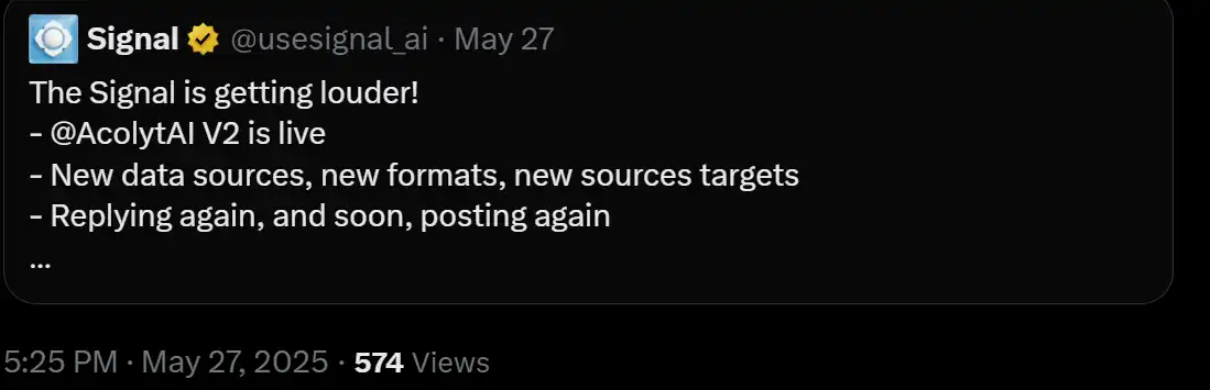 Signal V2 正式上线,功能大幅增强,usesignal ai 重新推出 AcolytAI,新增更多数据来源、格式选项和回复功能,收益表现即将发布。