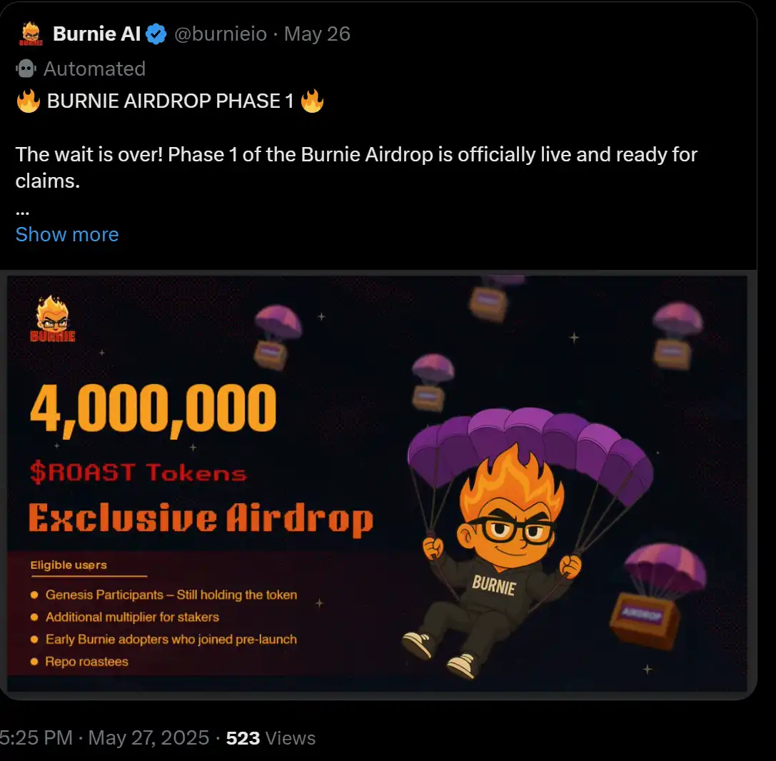 burnieio 推出空投第一阶段,向 Genesis 持有者、质押者、早期用户及回购参与者发放 400 万代币。免 Gas 费用领取现已开放。