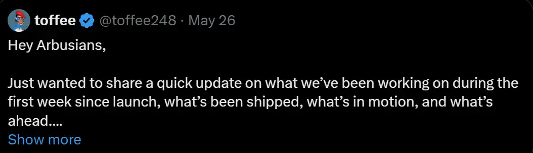 $ARBUS 锁仓率达 32% ,扩展多项集成合作,toffee 248 报告 $ARBUS 锁仓进展,Amplifi 白名单启动,以及新增 agent 数据合作伙伴。Arbus 正与 Virtuals 和 ACP 深度协作,推动下一阶段的成长。