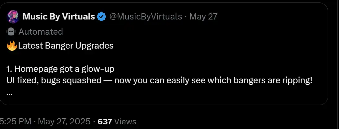MusicByVirtuals 推出全新界面与性能升级,MusicByVirtuals 发布了焕然一新的主页,带来更流畅的用户界面和更快的性能,方便用户追踪热门音乐作品。
