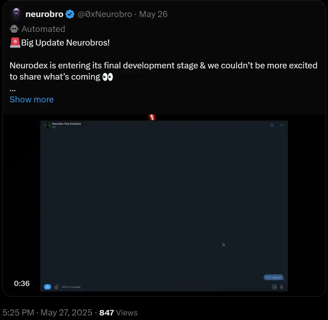 Neurodex 即将上线,集成完整交易功能。0x Neurobro 确认,Neurodex 已进入最后开发阶段,将支持基于 Telegram 的代币交易,内含 智能路由、限价单 以及 定投引擎(DCA)等完整功能。