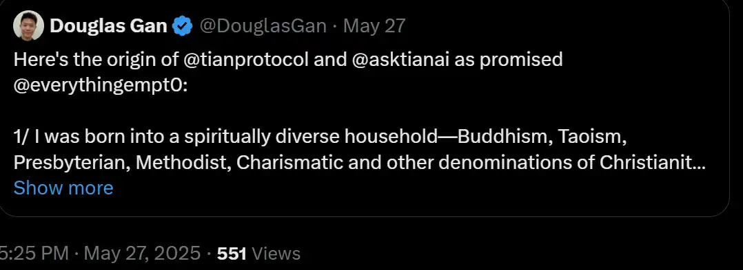揭秘 tianprotocol 和 asktianai 的起源故事,DouglasGan 分享了个人、精神与财务上的历程,讲述了如何创立 $TIAN 和 AskTian——一款融合形而上学智慧与去中心化技术的 AI agent。