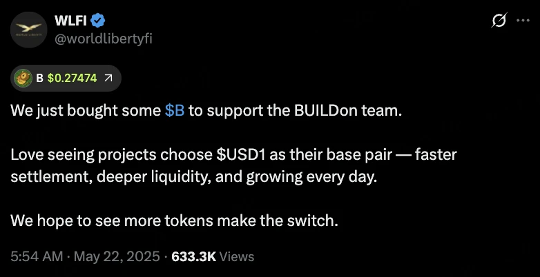 BUILDon 是 BSC 建设文化的吉祥物相关的 MEME,在 5 月 17 日是项目官宣添加 USD 1 交易对并且此后持续发推与 WLFI 进行互动。5 月 22 日,WLFI 宣布购买 BUILDon 代币 B,随后其价格价格拉涨超过 450% 。