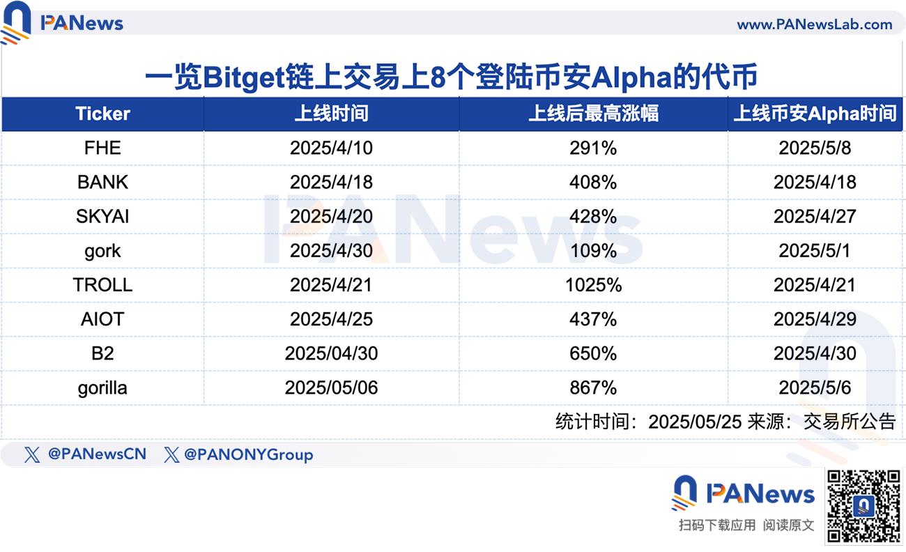 不仅如此,Bitget 链上交易的价值不仅体现在抢先上新,更体现在其对优质资产的持续赋能。截至目前,已有 8 个在 Bitget 链上交易的项目被币安 Alpha 收录,这不仅是时间差的体现,更是平台在项目判断、趋势捕捉和资源整合方面能力的集中展现。