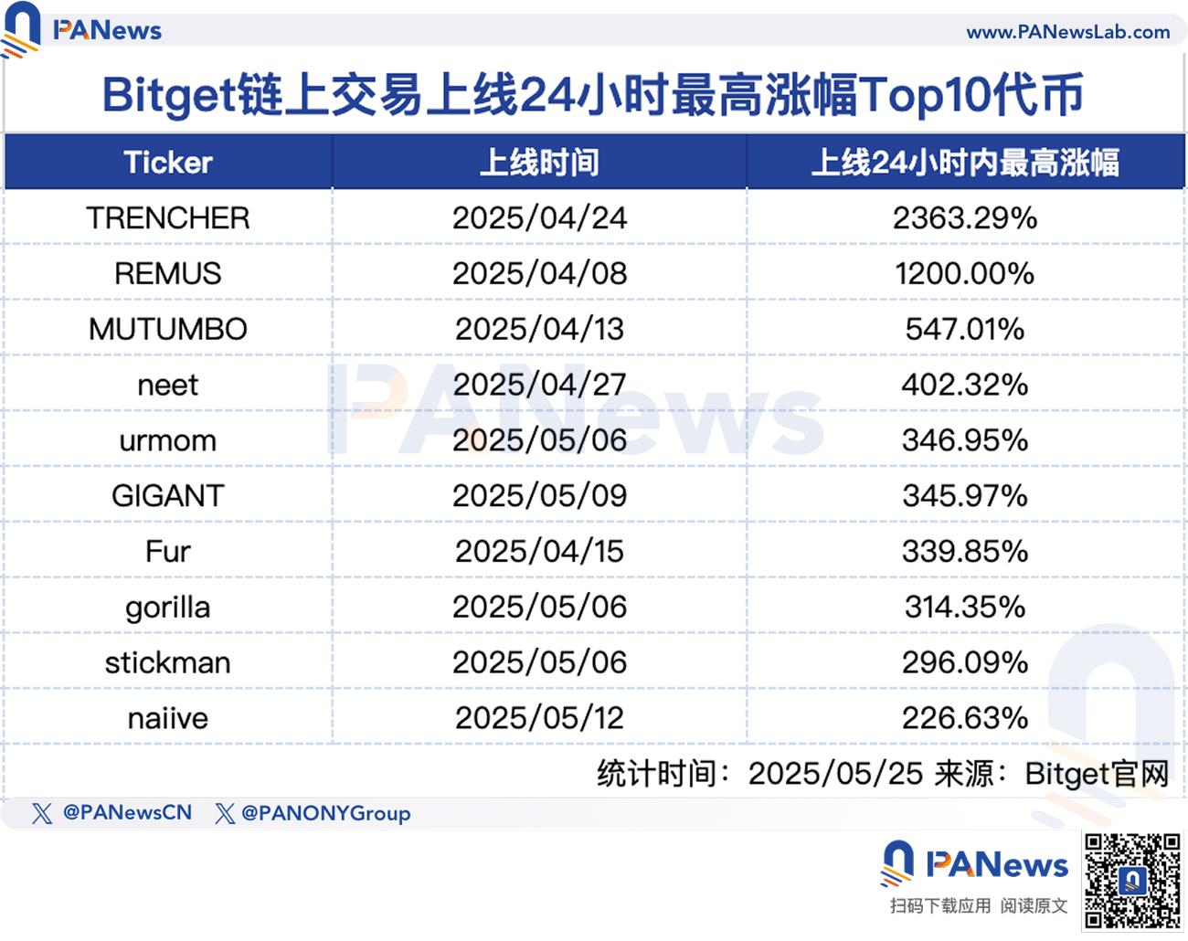 更具看点的是,多个项目展现出极具吸引力的投资回报。根据 PANews 统计的 Bitget 链上交易上线 24 小时内最高涨幅排名前十代币,整体平均涨幅达到 638.25% ,体现了其强劲市场表现与资金追捧力度。其中,TRENCHER、MUTUMBO 和 REMUS 更是实现了数倍甚至数十倍的惊人回报。这些代币多为尚未登陆币安等主流交易所的早期资产,更进一步印证了 Bitget 对捕捉早期优质资产的前瞻性与独立判断力。从时间分布来看,Bitget 链上交易持续产出“黑马”项目,不仅有效吸引了市场注意力,也强化了其早期资产发现方面的品牌影响力。