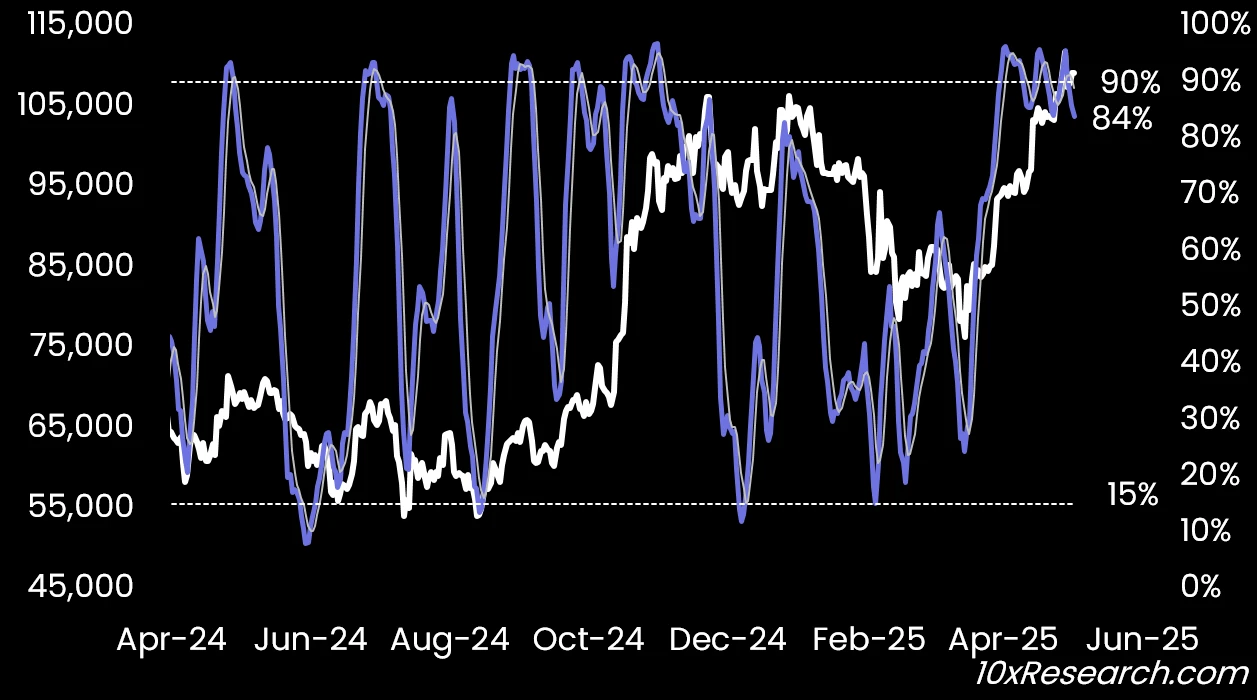 期权市场已经发出预警信号:比特币的隐含波动率偏度(Skew)——即看涨期权与看跌期权之间隐含波动率的差值——已经降至近 -10% ,这表明市场对看涨期权的定价远高于看跌期权。换句话说,交易者正积极追逐上涨行情,而非为下跌风险进行对冲。在我们的经验中,如此极端的偏度水平往往反映出市场处于极度乐观的顶部情绪,是一种典型的反向信号。