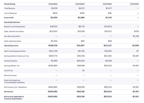 从年报数据来看,集团的归母净利润均处于负值,并在持续扩大中。2021年,净亏损195万美元,2023扩大至5183万美元,2024年更是创下历史新高,亏损达到4亿美元。从收入而言,尽管2023年从147万美元上涨至了413万美元,但2024年继续下滑,仅实现361万美元的收入,同比下降12%。