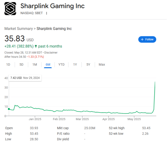 在这一典型示范效应下,今年以来,多家上市公司效仿,Tether、SoftBank、Bitfinex、Nakamoto Holdings 等玩家陆续加入战局。而除了部分相对大型的公司,中小型甚至部分主营业务濒临崩溃即将退市的企业也正在走上这条道路,“借壳装币”成为了成本最低的战略,但市场对此似乎也仍买账,估值溢价比比皆是,例如SharpLink,此前不过是一家市值不到200万美元的体育彩票营销公司,在实行以太坊金库后不过一周,市值就摇身一变飙升至25亿美元,在现实中上演了一波麻雀变天鹅的好戏。既能赚吆喝,又能赚钱,行业监管与政策动向还能被幕后老板一把掌控,如此好的标的,不外乎受到总统青睐。