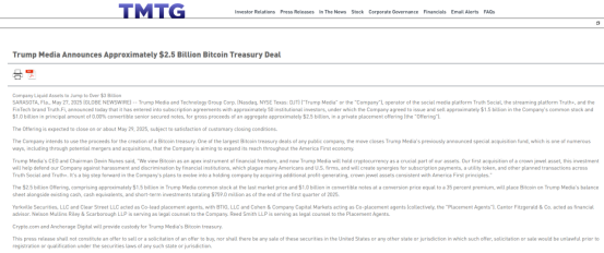 但24小时不到,金融时报的记者就此身分明了。根据特朗普媒体科技集团周二盘前发布的公告,公司宣布已经与50家机构投资者签署认购协议,发行价值15亿美元的普通股和10亿美元的零息可转债,转股价比当前市场价格高35%。本次发行预计将于5月29日前后完成。基于这25亿美元,公司计划建立比特币储备库。