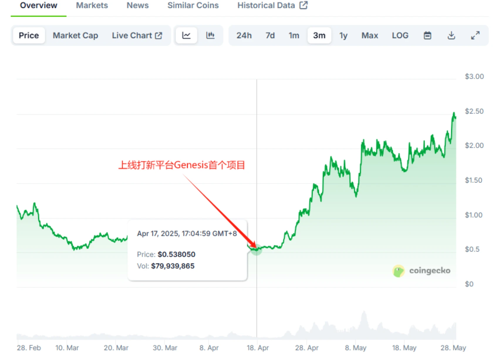其实, Virtuals 自家打新平台 Genesis 上线初期的打新项目整体价格表现一般,大部分项目成功开盘后仅有数十万美元市值,过百万市值的项目少之又少, 并未出现明显公认的“大金狗”,整体造富效应偏弱(点击此处查看相关内容: Virtuals 打新正热:AI Agent 板块的“Pump.fun”时刻要来了? )。
