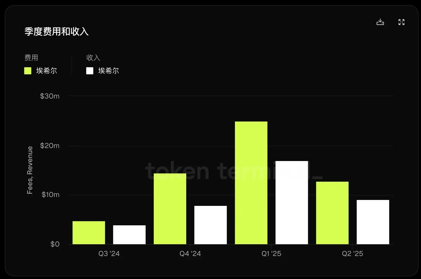 从 Token Terminal 提供的季度费用和收入图表来看, 2024 年第二季度,Aethir 的费用是 2500 万美元,收入是 2000 万美元,费用转化为收入的比例达到了 80% 。