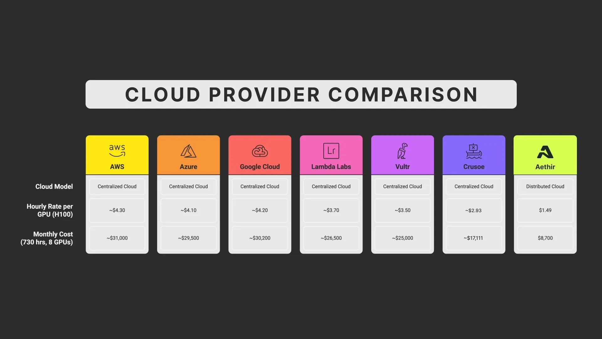 相比 AWS 这样的中心化云服务,Aethir 在成本和灵活性上更有优势。AWS 的 GPU 实例(比如 G 5)按小时计费,每小时大概 3 美元,而 Aethir 的按需使用模式可能把成本降到 2 美元/小时。
