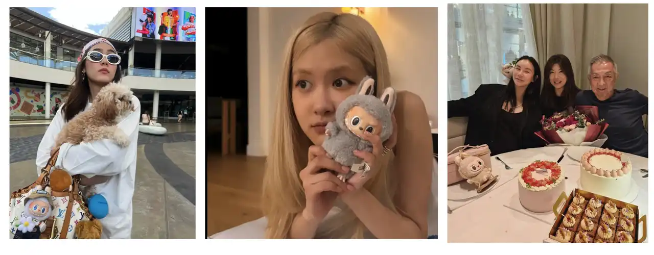全球时尚教母级女明星 Rihanna 将一只粉色 Labubu 挂在她的 Louis Vuitton 托特包上出机场;流行音乐奖项收割机,和新一代国际时尚宠儿 Dua Lipa 则在 IG 上晒出两只 Labubu 挂在她橙色手袋上,一度成为热搜;Lisa 的名字对中国年轻人再熟悉不过,这个顶流韩团成员的 Instagram Story 里,常常出现满墙的 Labubu 收藏,堪称 Labubu 野生品牌大使。