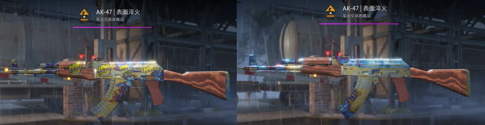 这款 AK-47 表面淬火,虽然两把都是「崭新出厂」级别的磨损度,但左边这把只是普通的图案模板,可以看到在武器上蓝色部分的分布少且不均匀。右边这把则是最顶级的 #661 图案模板,蓝色部分的分布大且集中于枪口和枪顶。因此左边在 BUFF 市场上的挂售价格只有 2500 RMB 左右,而后者则是百万,尽管 AK-47 表面淬火并不是稀有度等级最高的武器皮肤