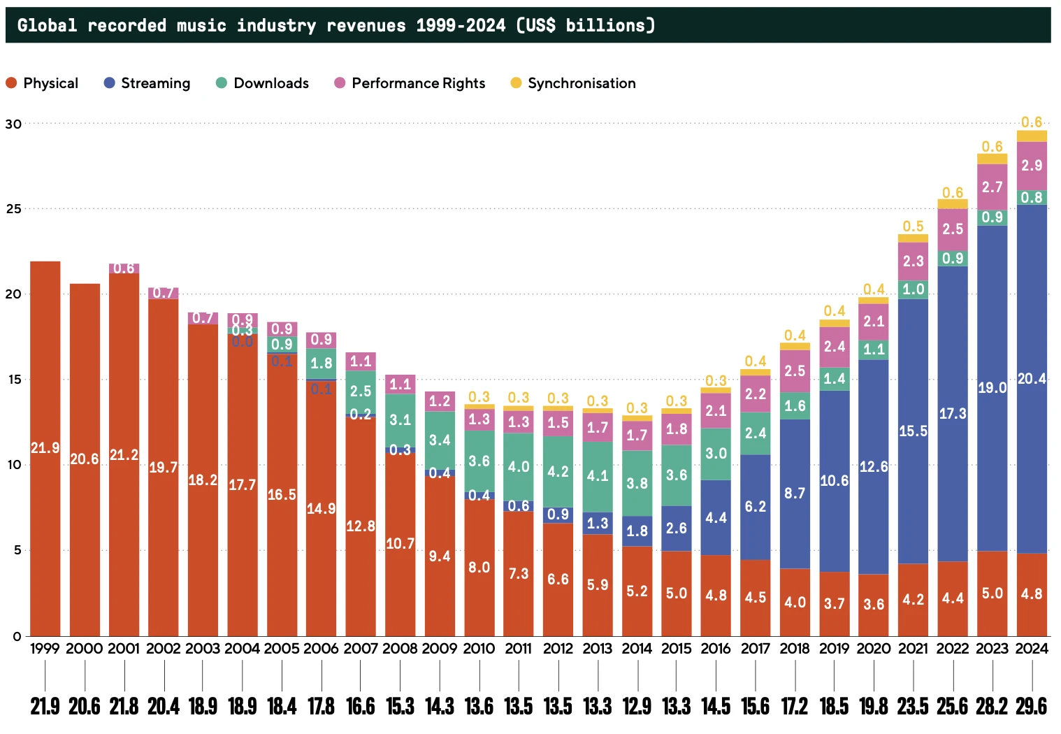 据 国际唱片业协会(IFPI) 2025 年报告 ,全球音乐产业年收入逼近 300 亿美元,其中表演权收入较 2010 年翻倍,成为稳定现金流的重要来源。Aria 也顺应这一趋势,将音乐 IP 转化为可组合、可交易的链上金融资产。