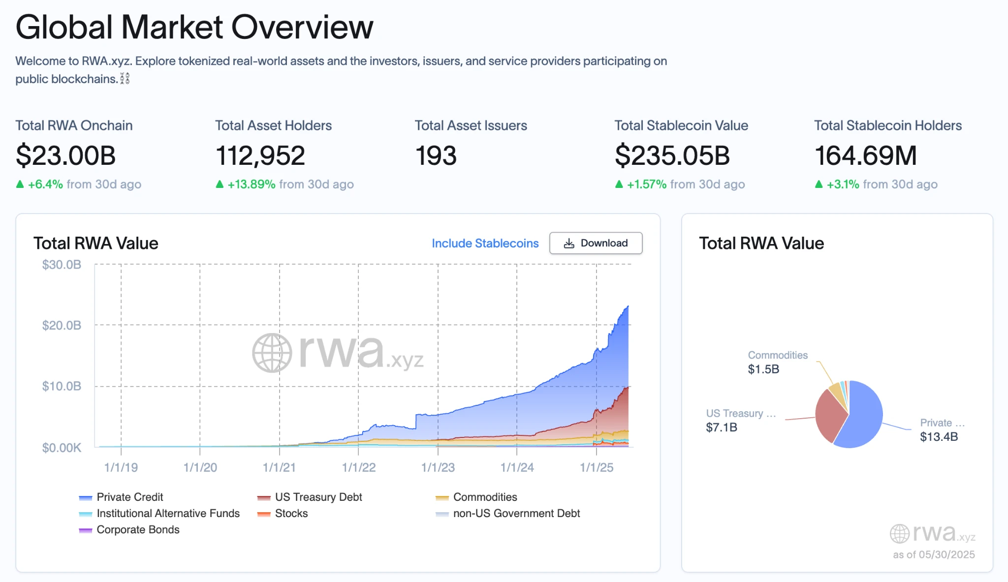 数据,截至撰稿时,链上 RWA 总市值突破 230 亿美元,月增 6.4% 。尽管当前仍以美债、私人信贷、大宗商品为主,但特许经营类资产和其他非标资产正成为新的关注焦点。