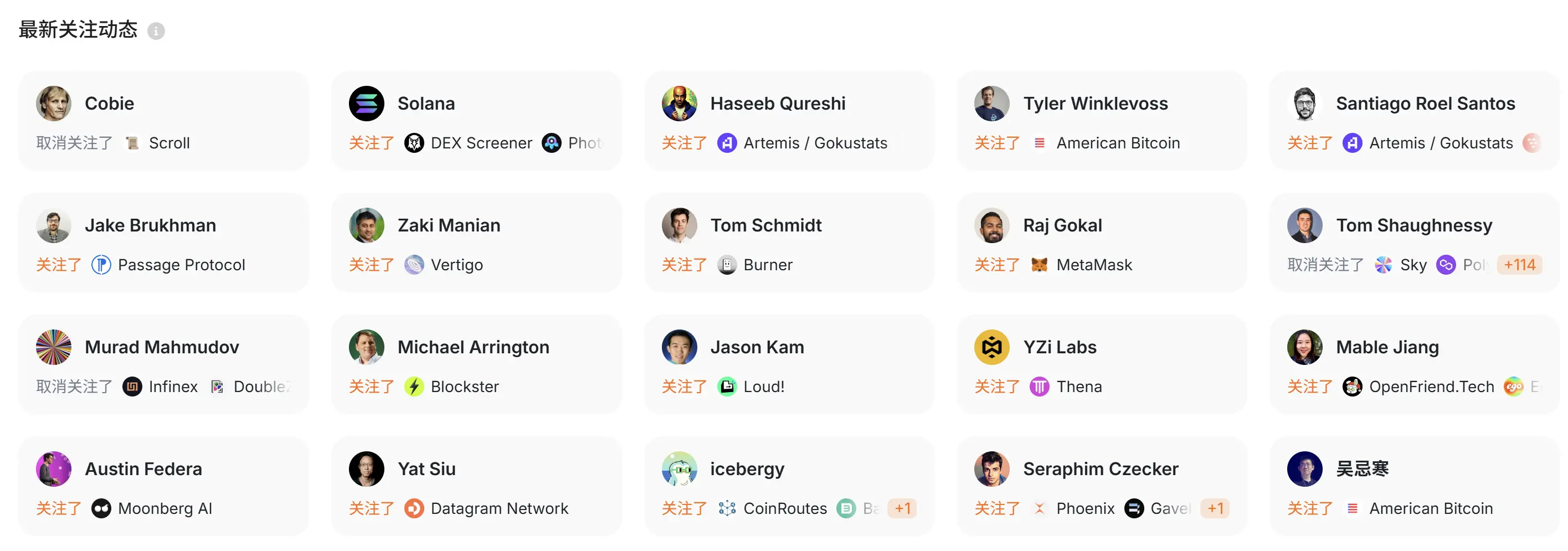 同时,我们也可以查看知名人物的对外关注与取关动态,比如何一近期关注了Rita、川沐、雕刻等人物,取关了冰蛙,赵长鹏近期取关了子时、Travala.com 等账号。