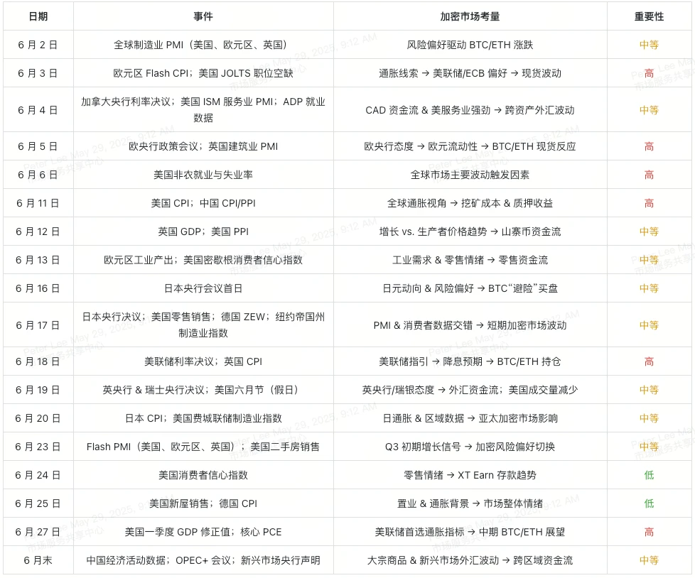 6 月对加密交易者来说至关重要,全球经济日历排得满满当当,从 PMI、CPI 数据到央行决议,常常引发 比特币(BTC) 、 以太坊(ETH) 及其他数字资产的大幅波动。随着这些宏观经济数据和事件陆续揭晓,它们会重塑市场风险偏好和资金流向,进而影响 BTC 和 ETH 的价格 。对于同时参与 BTC 现货 和 ETH 现货 交易的投资者而言,准确掌握每个数据发布的时间和潜在影响,往往决定盈亏成败。
