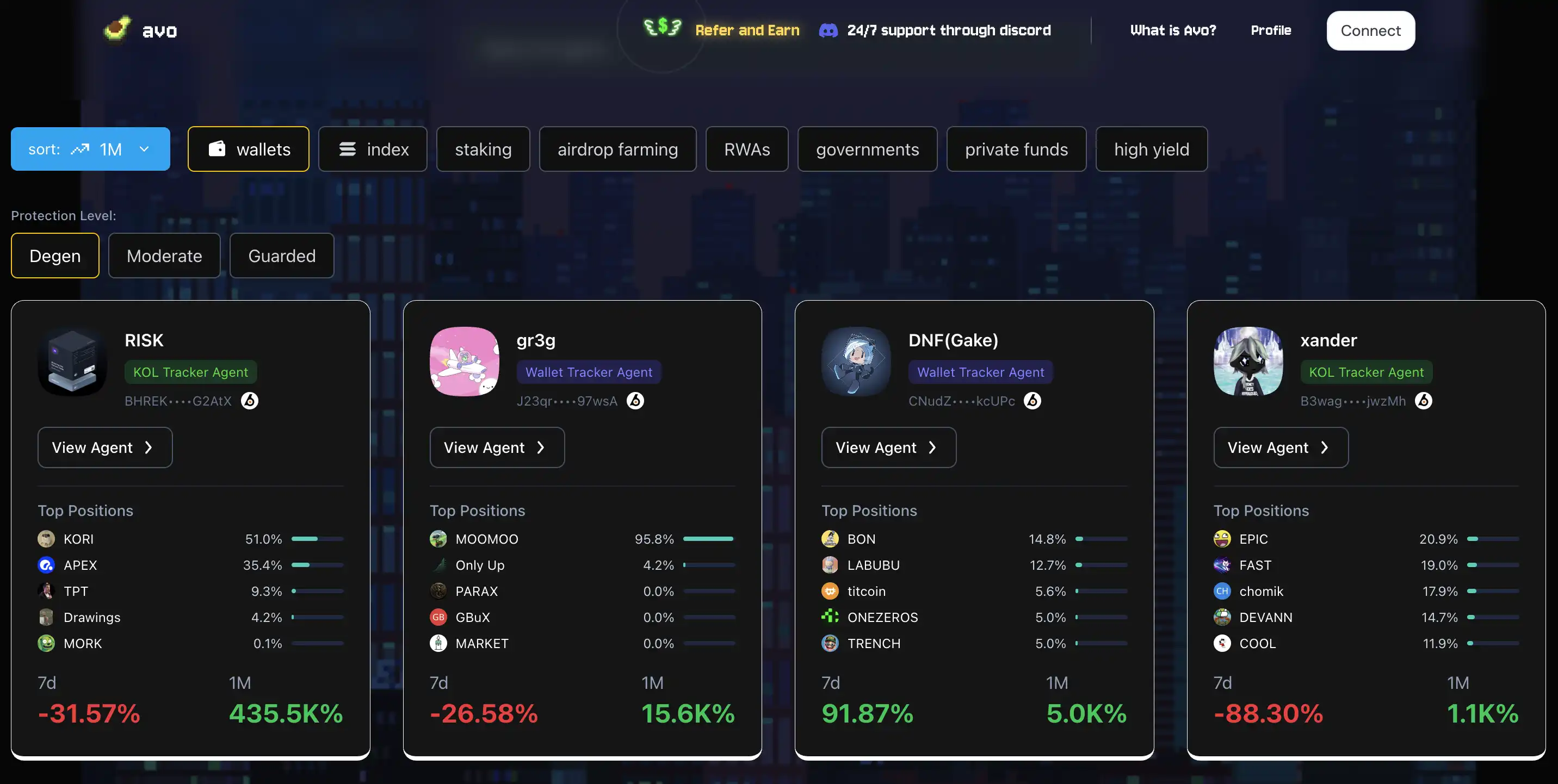 AVO 是一个交易 AI Agent 的市场,包括钱包跟踪、机构跟单、质押、空投猎手等等类型的 AI Agent。当下这个平台上主要出售链上的交易策略。