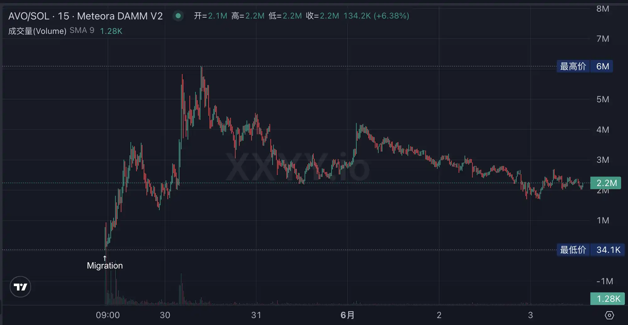 AVO 在 5 月 30 日 Solana 的创始人 Toly 转发演示视频后一度突破 600 万美元市值,现回调至 200 万美元。
