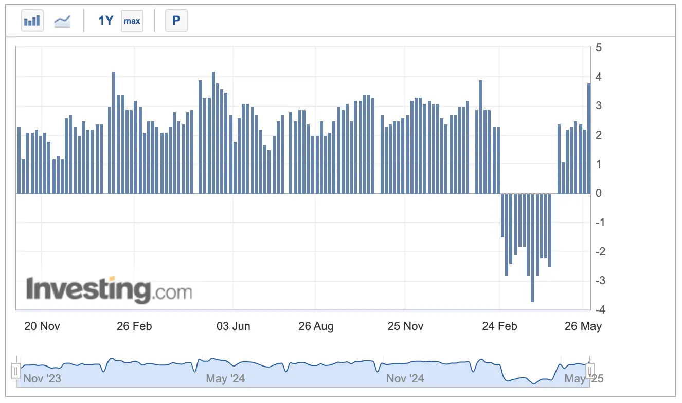 在经历过去几月的低估之后,GDP软数据录得反弹。亚特兰大联邦储备银行发布的GDP Now数据显示,4月底以来数据重回零轴之上,及至5月底达到3.8%,表现出关税战放缓之后的乐观情绪。