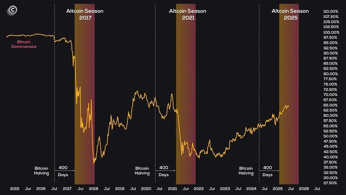 山寨币季节会在比特币主导权明确回落后开始——而不是还在周期高位盘整时。
