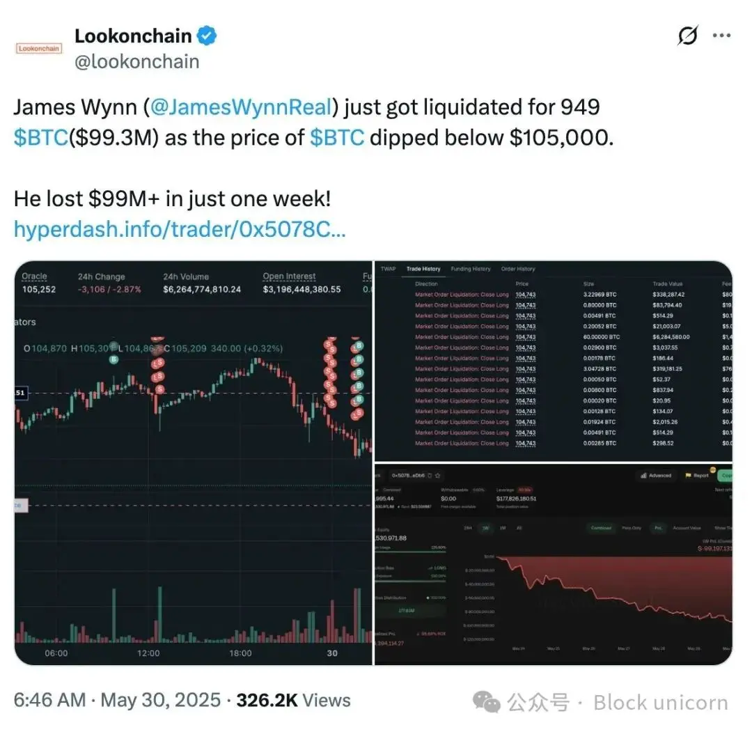 第 8 天(5 月 30 日) : 随着比特币跌破 10.5 万美元,James Wynn 被平仓,损失了 949 比特币,价值 9930 万美元。