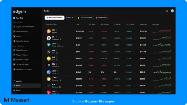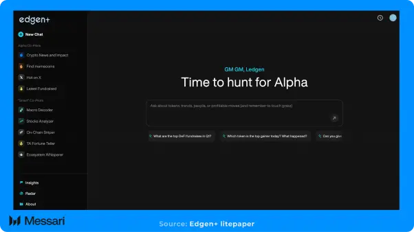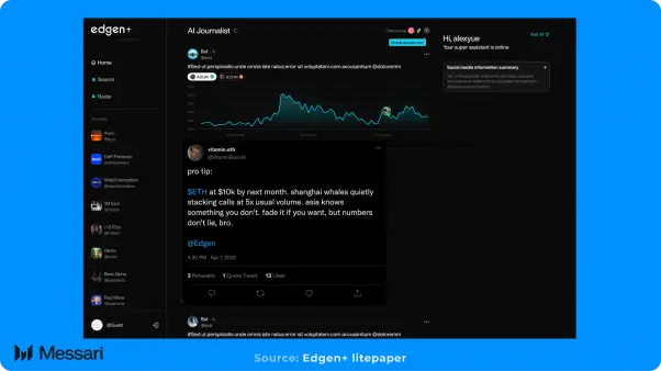 Edgen 是 EVG 旗下的项目,致力于解决加密市场信息碎片化的问题,协助散户投资者获取实时、机构级 的市场情报。该平台能帮助用户分析新兴趋势与资产动态,并发掘可执行的投资见解。Edgen 作为一个信 息编排层与应用界面,整合大语言模型(LLM)、智能体(Agents)及实时数据流,为用户提供具备上下文的 即时资讯。