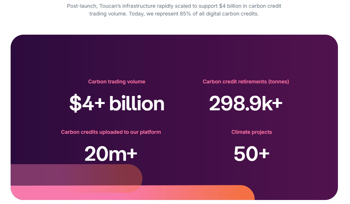 Toucan 将碳信用代币化,创建链上碳市场,允许企业和个人购买碳抵消代币。2024 年,Toucan 的碳代币交易量超过 1 亿吨 CO 2 当量。 2025 年,Toucan 继续在碳市场基础设施建设上发挥重要作用,推动碳移除领域的透明性和效率。