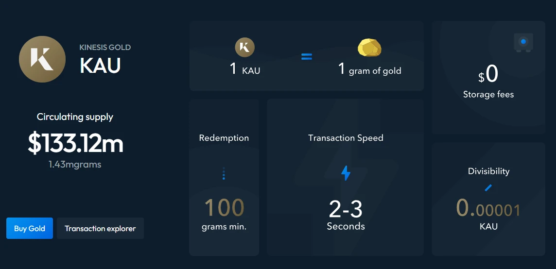 Kinesis Gold (KAU) 是一种数字货币。每枚 KAU 都由一克纯金支撑,这些纯金以您的名义存储在经过全面保险和 审计的 金库中。KAU 让您能够在世界任何地方消费、交易、发送和赚取实物黄金。