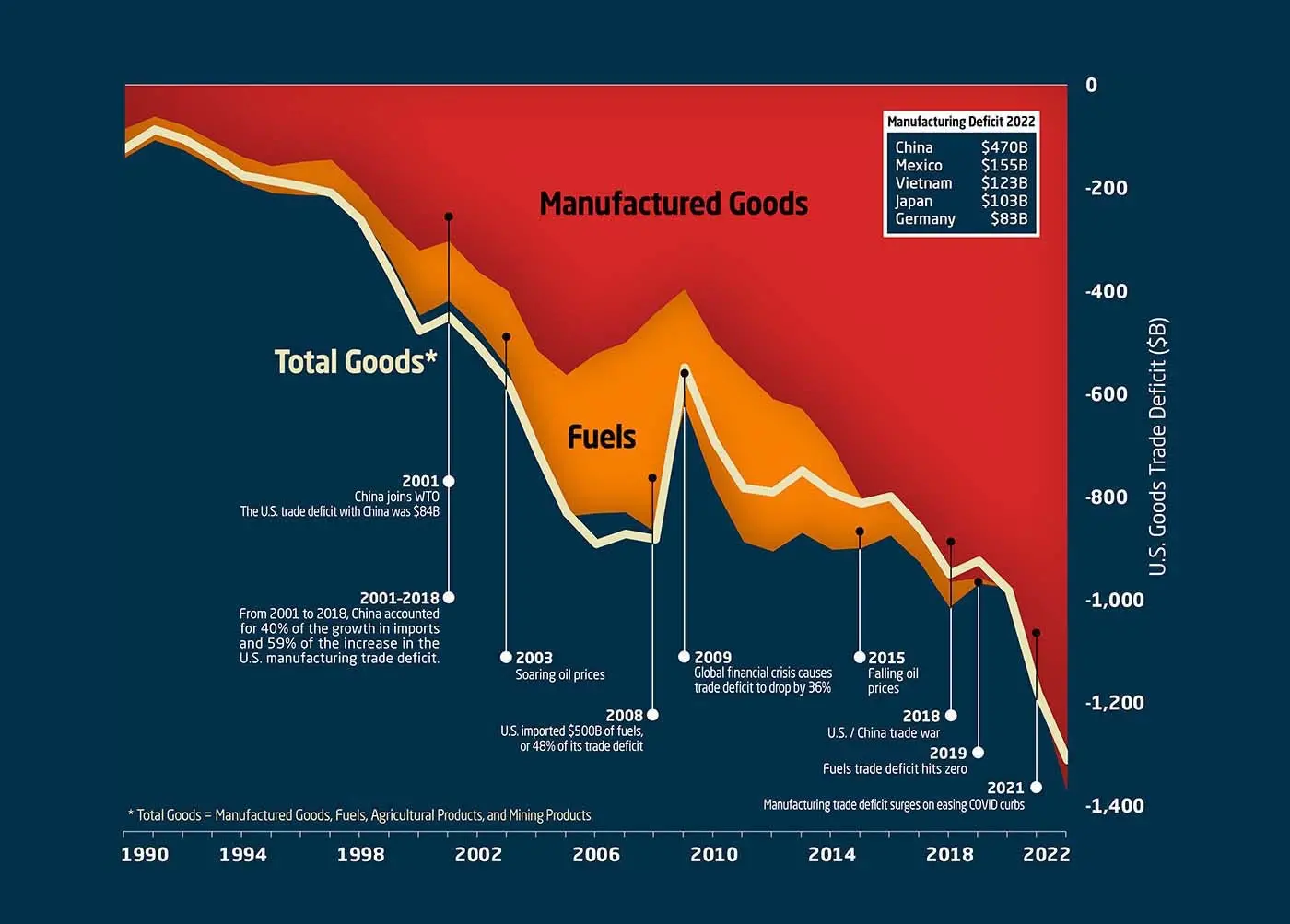 自20世纪90年代以来,美国将大量生产外包到中国、日本、德国以及海湾国家,并以新印刷的美元支付这些进口商品。由于进口远远多于出口,美国长期面临巨额贸易逆差。所谓贸易逆差,指的是一个国家从全球购买的商品总额与其出口商品总额之间的差距。