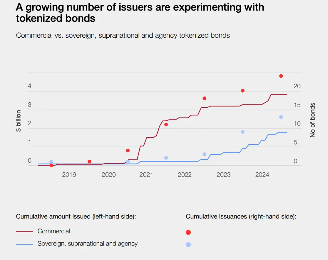 公司如 Siemens 和 UBS 在 ECB 的试验中发行了链上债券。日本政府也正在测试市场,与野村合作将债券上链。