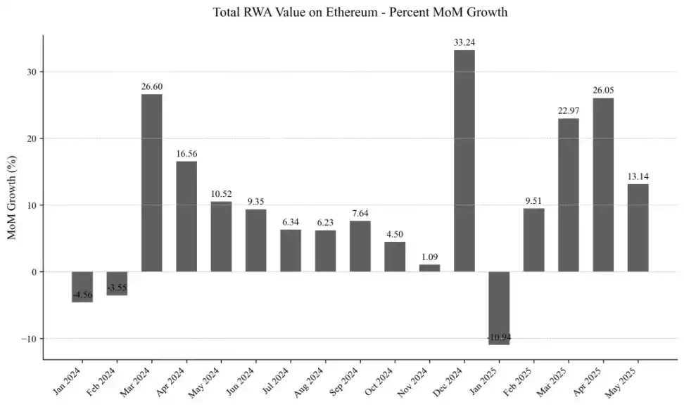 聚焦 2024 年初至今的月度数据,增长浪潮始于 2024 年 4 月,当月实现 26.6% 的惊人涨幅——单月贡献以太坊 RWA 总增量的四分之一。此动能延续至后续三个月,虽在 2024 年 8 至 12 月期间略有放缓,但网络仍保持约 2 亿美元 / 月的增量(环比增速约 5% ,年化超 60% )。