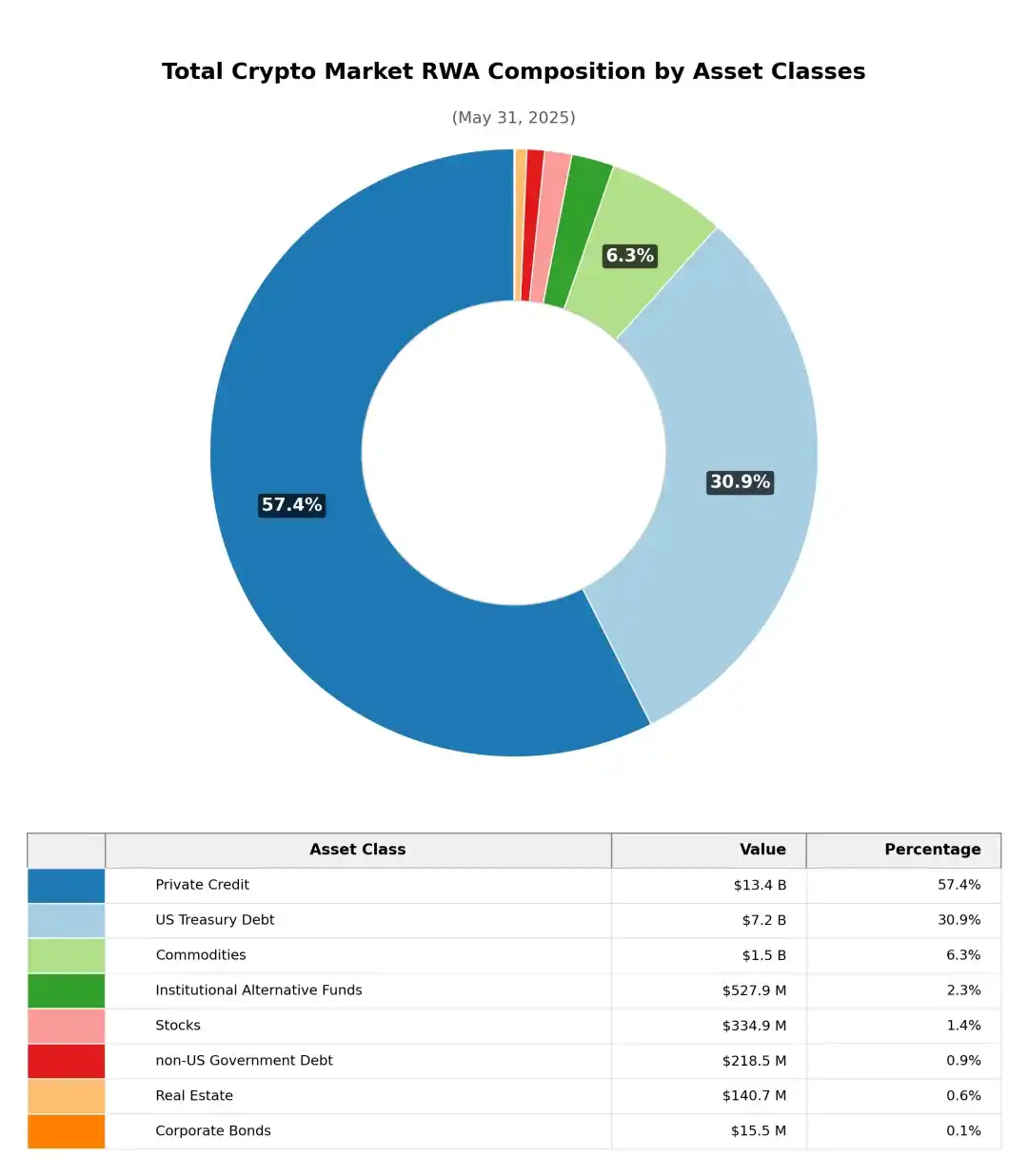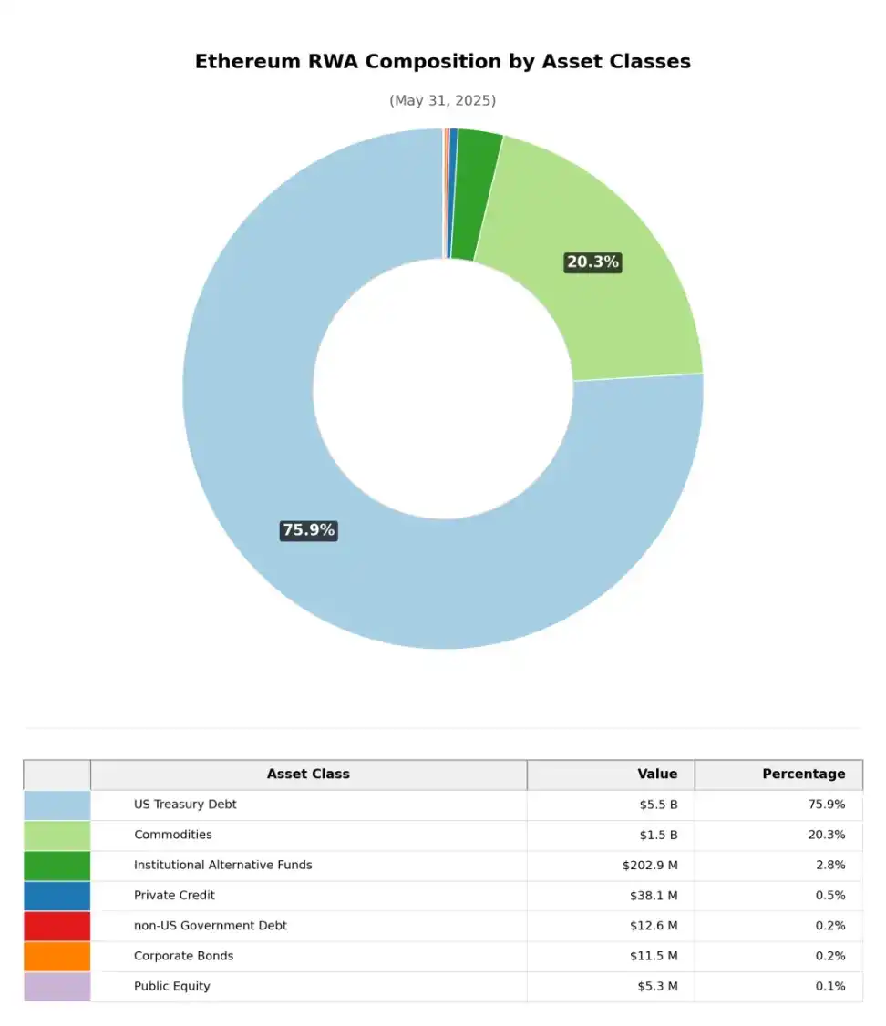 按资产类别划分(稳定币除外),以太坊上的真实世界资产(RWA)市值高度集中于两个主要品类:国债类项目(75.9% )和大宗商品类(以黄金为主, 20.3% ),其他类别占小。相比之下,在整个加密市场的 RWA 市值构成中,私募信贷占比最高(57.4% ),国债类项目次之(30.9% )。