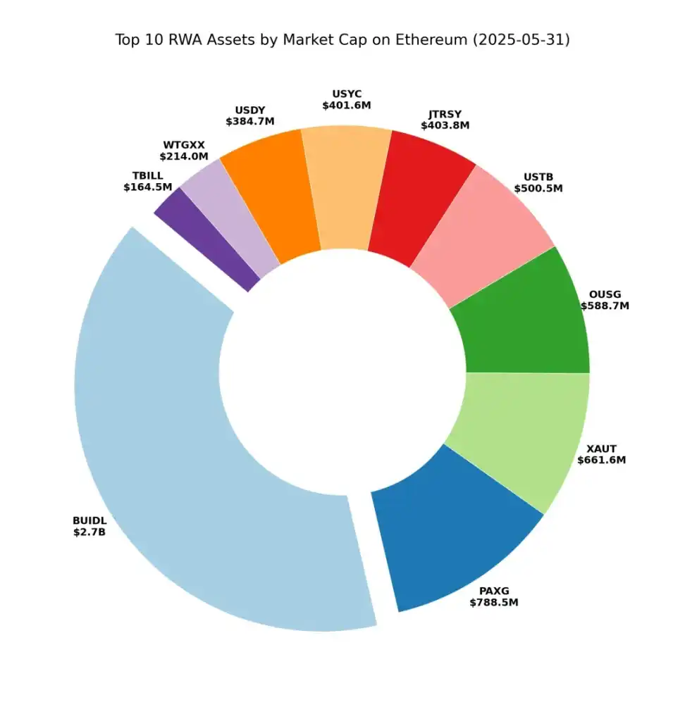 进一步聚焦以太坊 RWA 头部资产,饼状图清晰揭示 BUIDL 的统治地位。回溯一年前对比可见:彼时 BUIDL 规模尚与 PAXG、XAUT 等产品相当,如今已形成显著超越。尽管十大头部项目构成基本稳定,但国债类产品增速显著领先于黄金类产品,市场份额持续扩大。