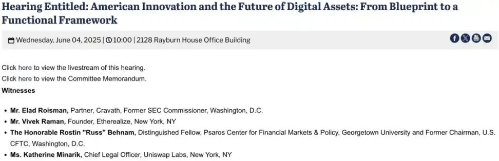 近期,Etherealize 创始人 Vivek Raman 受邀出席国会众议院金融服务委员会,关于「美国创新与数字资产未来」的听证会,继续扩大 Ethrealize 与监管交流的重要作用。