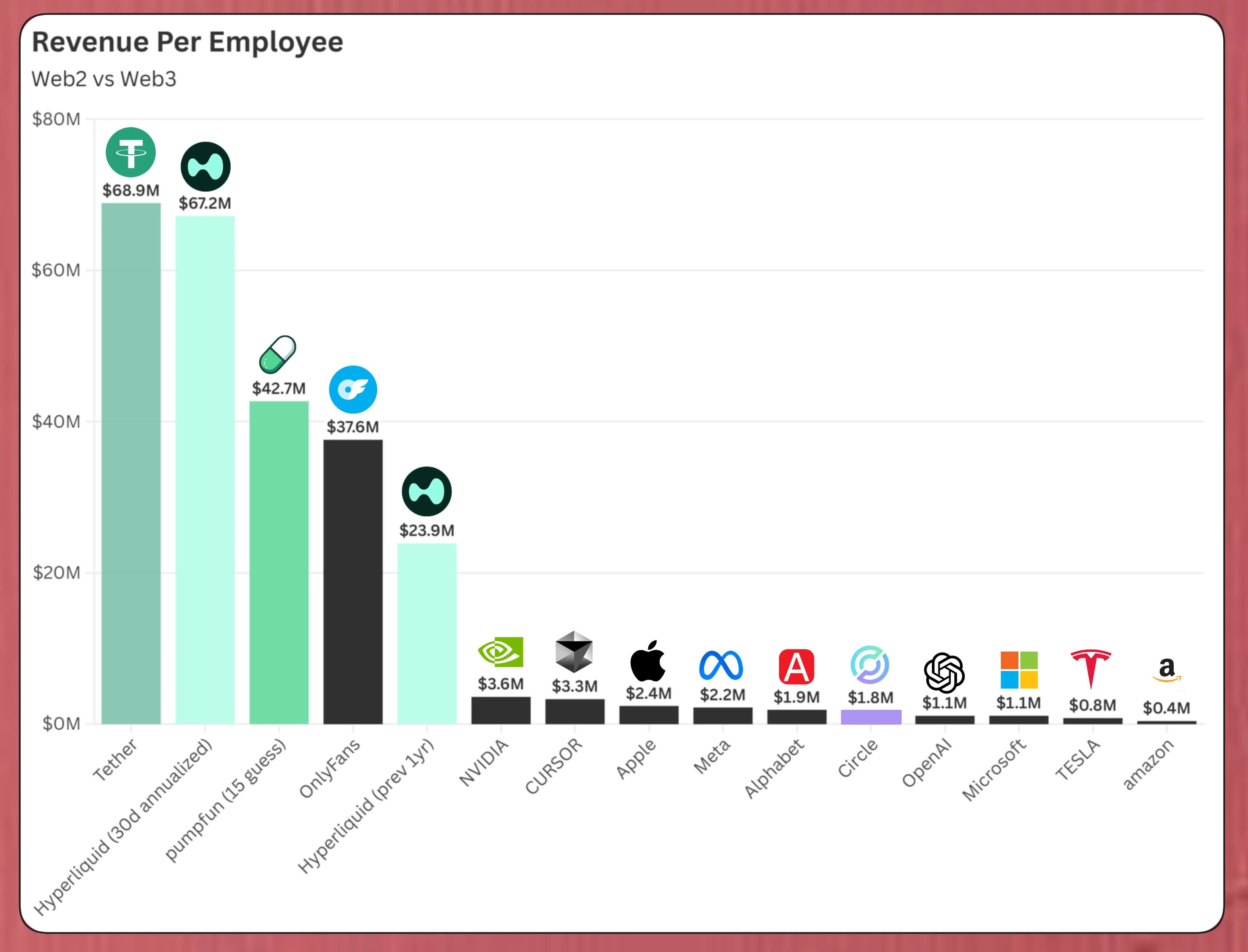 pump.fun 平台累计手续费收入约 7 亿美元,根据海外 KOL BREAD 估计其人效比已经超越英伟达、苹果等Web2顶尖科技公司。