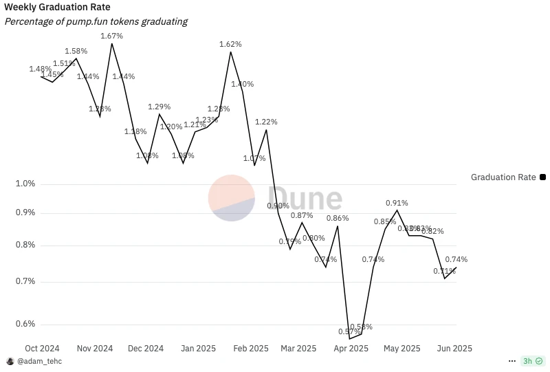 根据 Dune 数据,pump.fun 平台代币创建数量和毕业率(从内盘成功发射代币与总创建代币比率)自 2 月份断崖式下降,代币创建数量由巅峰时期每日 5-7 万个下降为每日 2-3 万个,代币周毕业率不足 1% 。