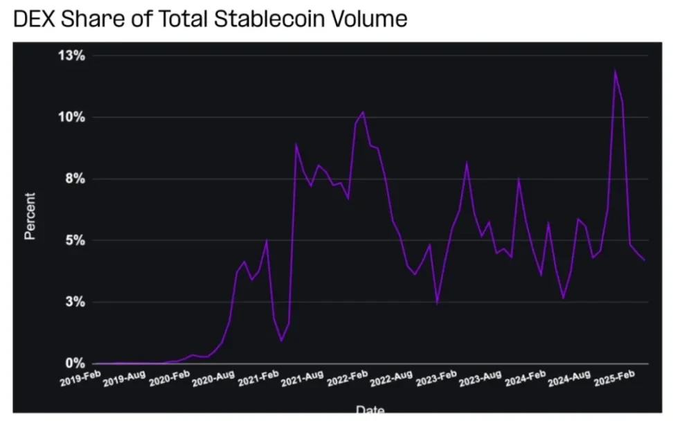 DeFi 中稳定币的交易量大部分来自 DEX。DEX 在总交易量中的份额随着市场情绪和交易趋势而波动,最近 memecoin 的交易量飙升至 5000 亿美元以上,占总交易量的 12% 。