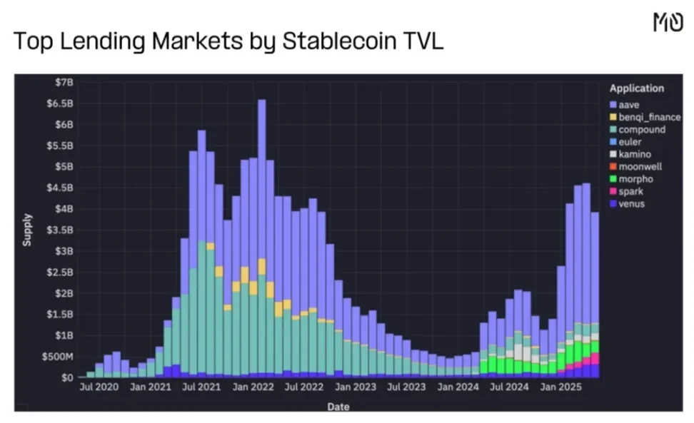 尽管借贷业务已从峰值回落,但 Aave 已显示出强劲复苏势头,而 Morpho、Spark 和 Euler 等新协议也获得了关注。