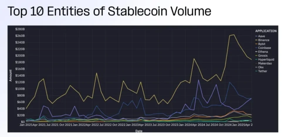 稳定币交易量最高的实体往往是中心化交易所,其次是 DeFi 和发行机构。CEX 交易量并不反映 CEX 平台上的交易,因为大多数交易发生在链下。相反,它反映了用户充提、交易所间转账以及内部运营活动。