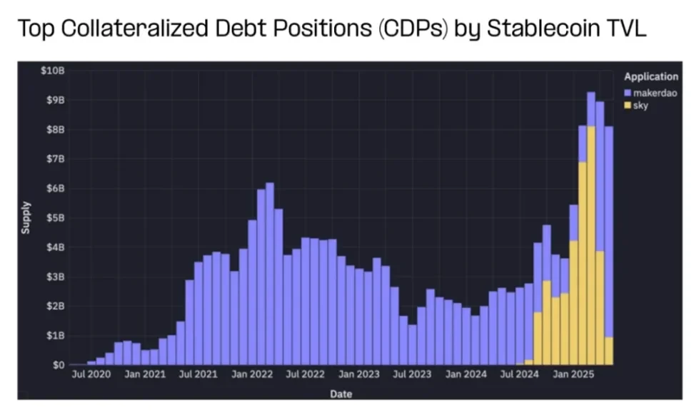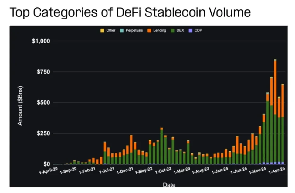 过去六个月,DeFi 稳定币的月交易量已从约 1000 亿美元增长至 6000 亿美元以上,这主要得益于去中心化交易所 (DEX)、借贷市场和抵押债仓 (CDP) 的大幅增长。