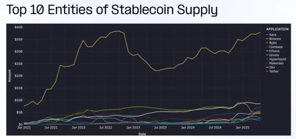 大多数稳定币供应都集中在中心化交易所,其中币安占据相当大的领先地位。DeFi 协议和发行者也占有相当大的份额。