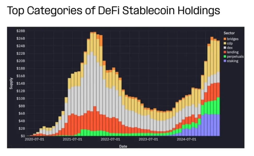 DeFi 稳定币的供应来自抵押品、流动性提供者 (LP) 资产,以及借贷市场、去中心化交易所 (DEX) 和衍生品协议的结算层。过去六个月,CDP、借贷、永续合约和质押的供应量几乎翻了一番。